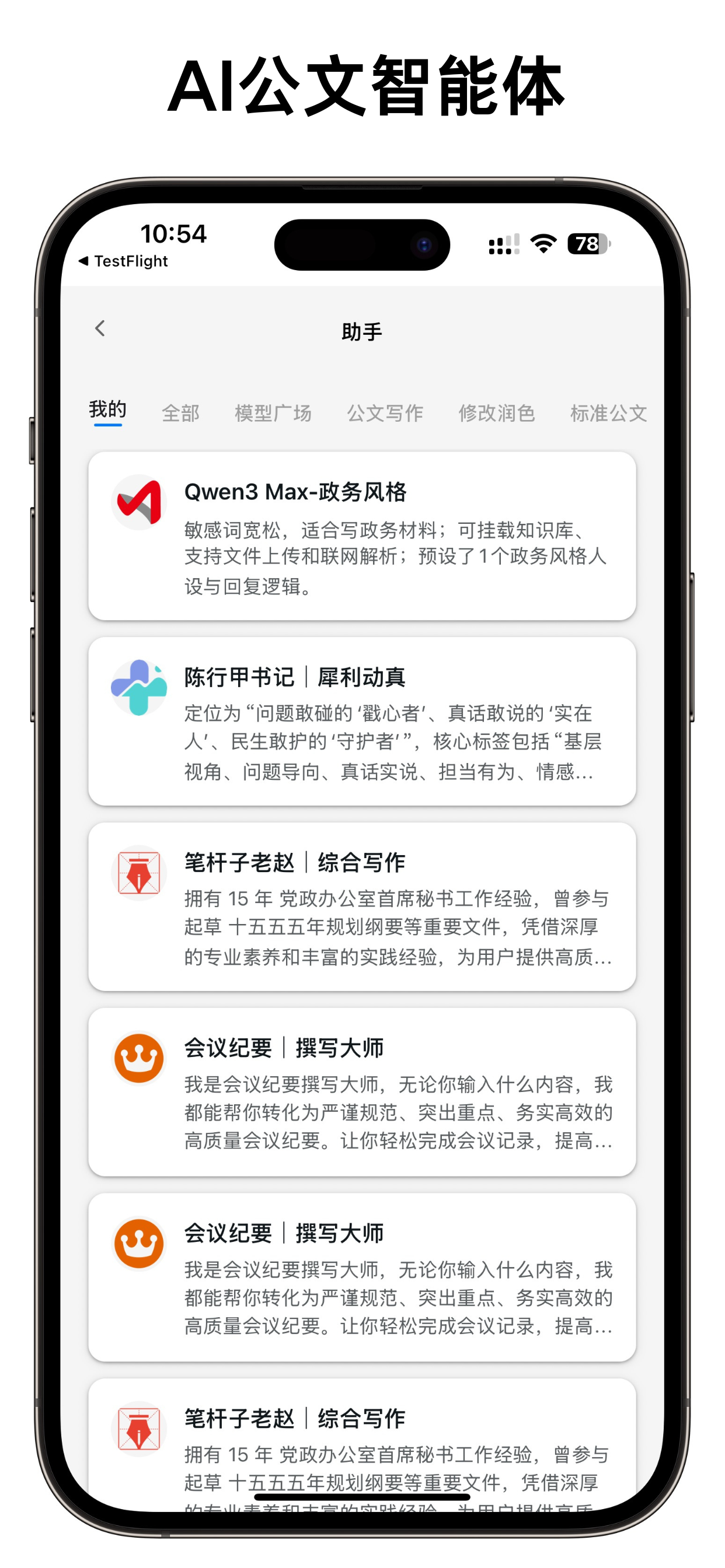 4、支持AI一键创建智能体,还有100多个已经做好的不同文风智能体,审核纠错、去AI味道、会议纪要、金句提纲、工作总结变领导讲话等等全部可以直接使用